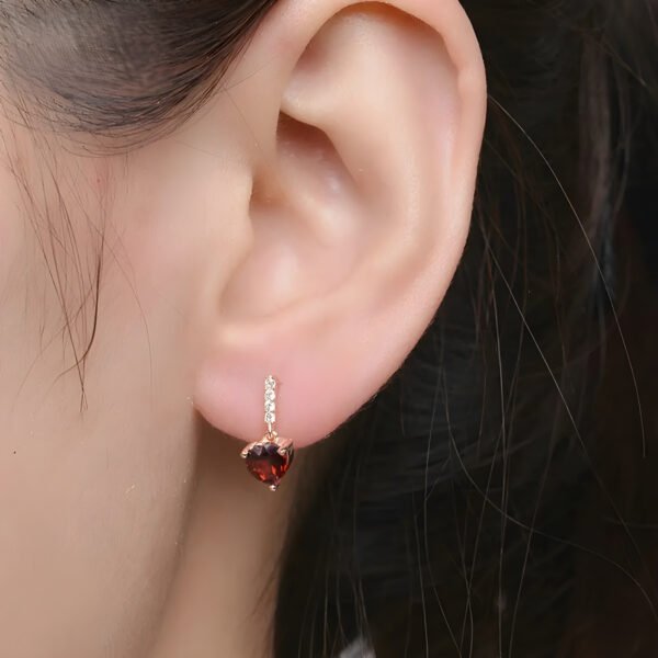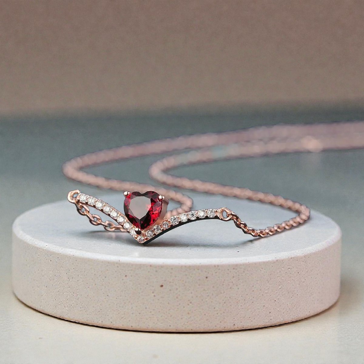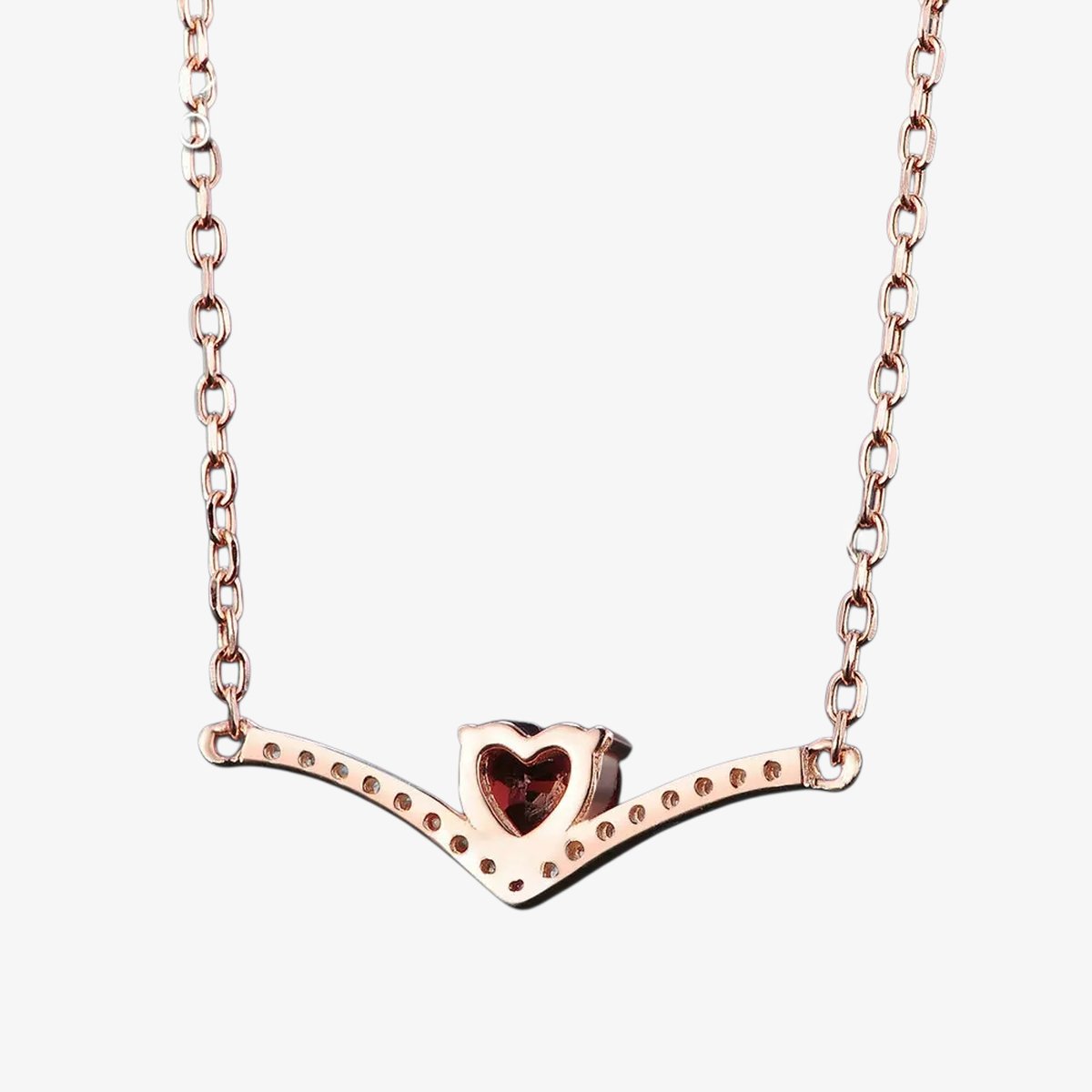 Posé sur une fine plaque en V pavée de zircones scintillants, un grenat taillé en cœur déploie son rouge profond avec éclat.